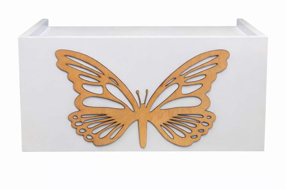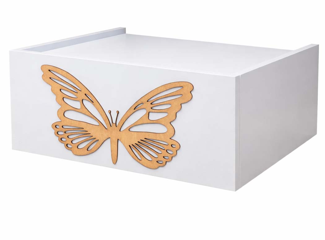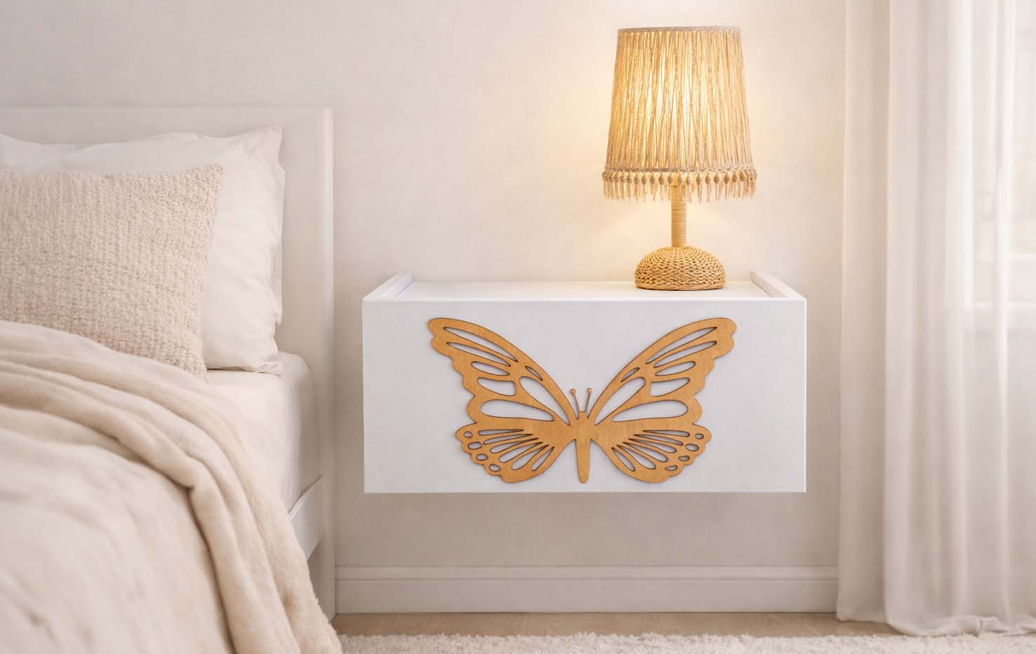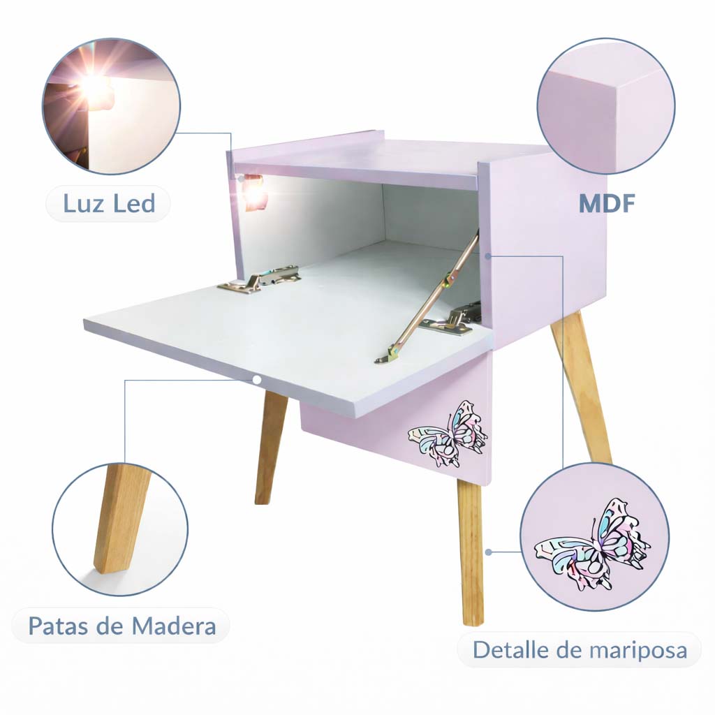 Buró o mesa de noche infantil en color blanco con delicado detalle de mariposa decorativa. Su diseño compacto de 40 cm de ancho, 20 cm de alto y 30 cm de profundidad