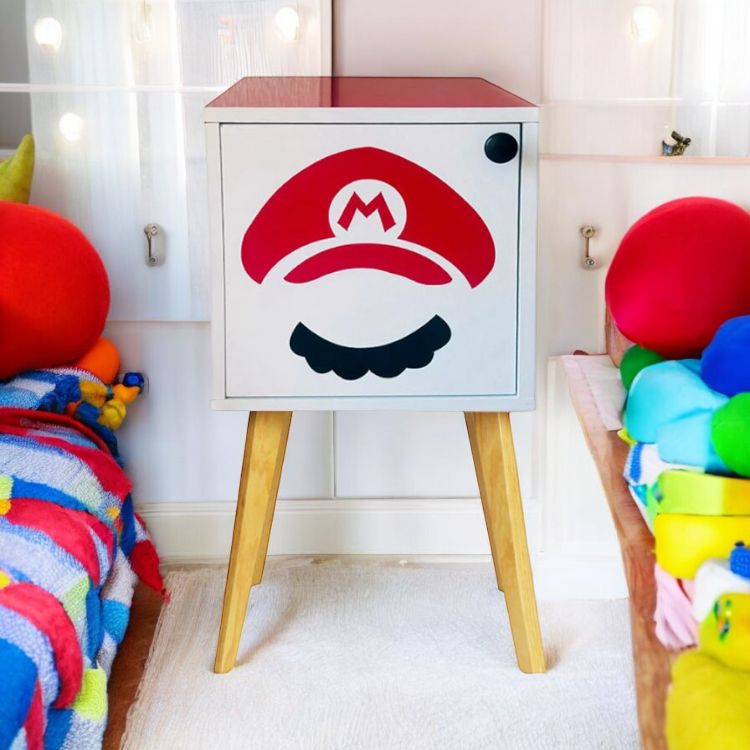 Buró infantil de Mario Bros con puerta de 30 × 30 cm, fabricado en melamina resistente. Ideal para recámaras de niños, práctico, duradero y con diseño divertido que transforma cualquier espacio.