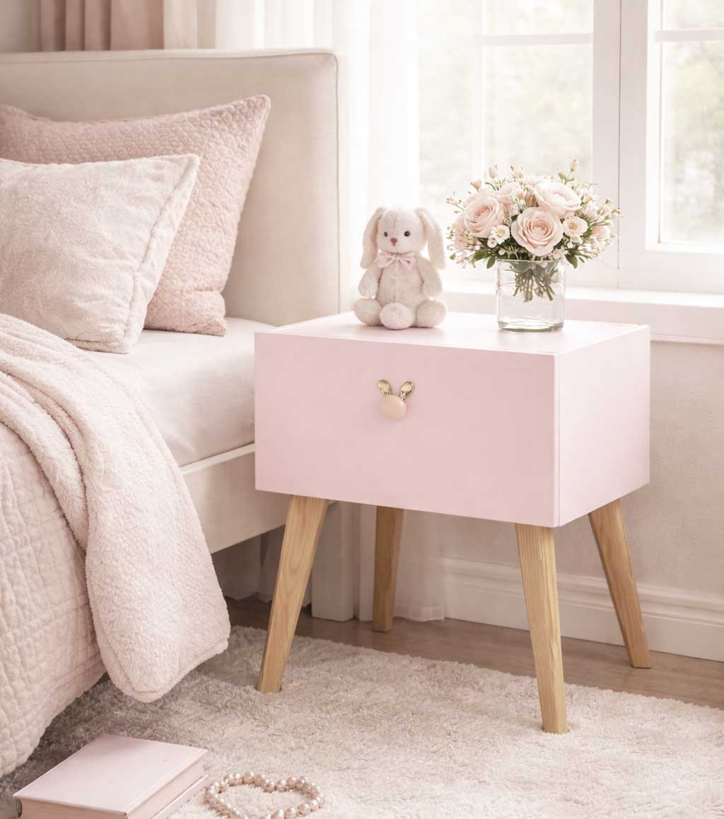 Buró o mesa de noche infantil en color rosa con delicado detalle de mariposa decorativa. Su diseño compacto de 40 cm de ancho, 20 cm de alto y 30 cm de profundidad lo hace ideal para habitaciones infantiles, aportando un toque dulce y moderno.