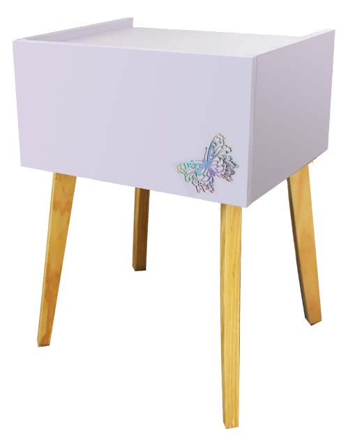 Buró o mesa de noche infantil en color lila con delicado detalle de mariposa decorativa. Su diseño compacto de 40 cm de ancho, 20 cm de alto y 30 cm de profundidad lo hace ideal para habitaciones infantiles