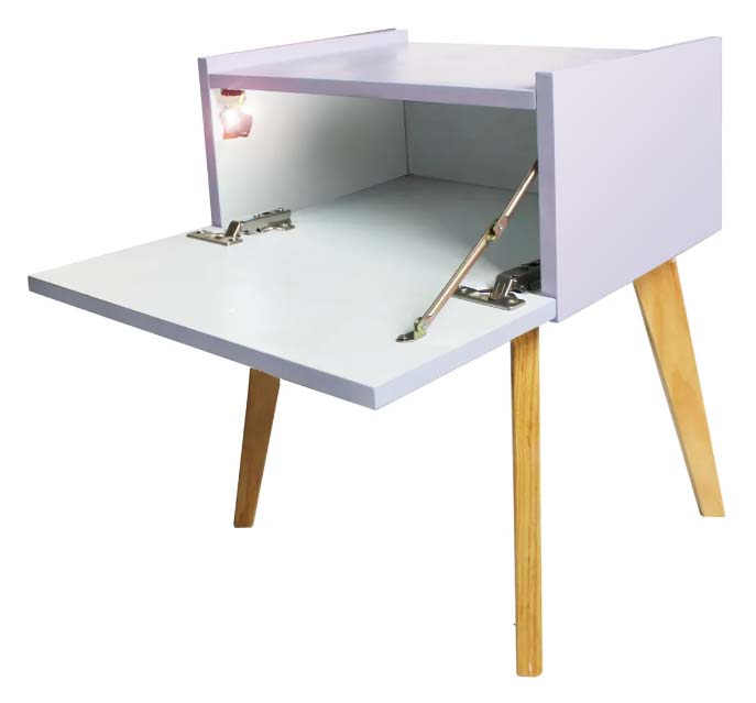 Cuenta con patas de madera en tono natural, que no solo brindan excelente estabilidad, sino que también crean un contraste elegante con el color lila del cuerpo del buró. Gracias a su tamaño compacto de 40 cm de ancho, 20 cm de alto y 30 cm de profundidad, es ideal para colocarse junto a la cama y mantener a la mano objetos como lámparas, libros, juguetes o accesorios decorativos.